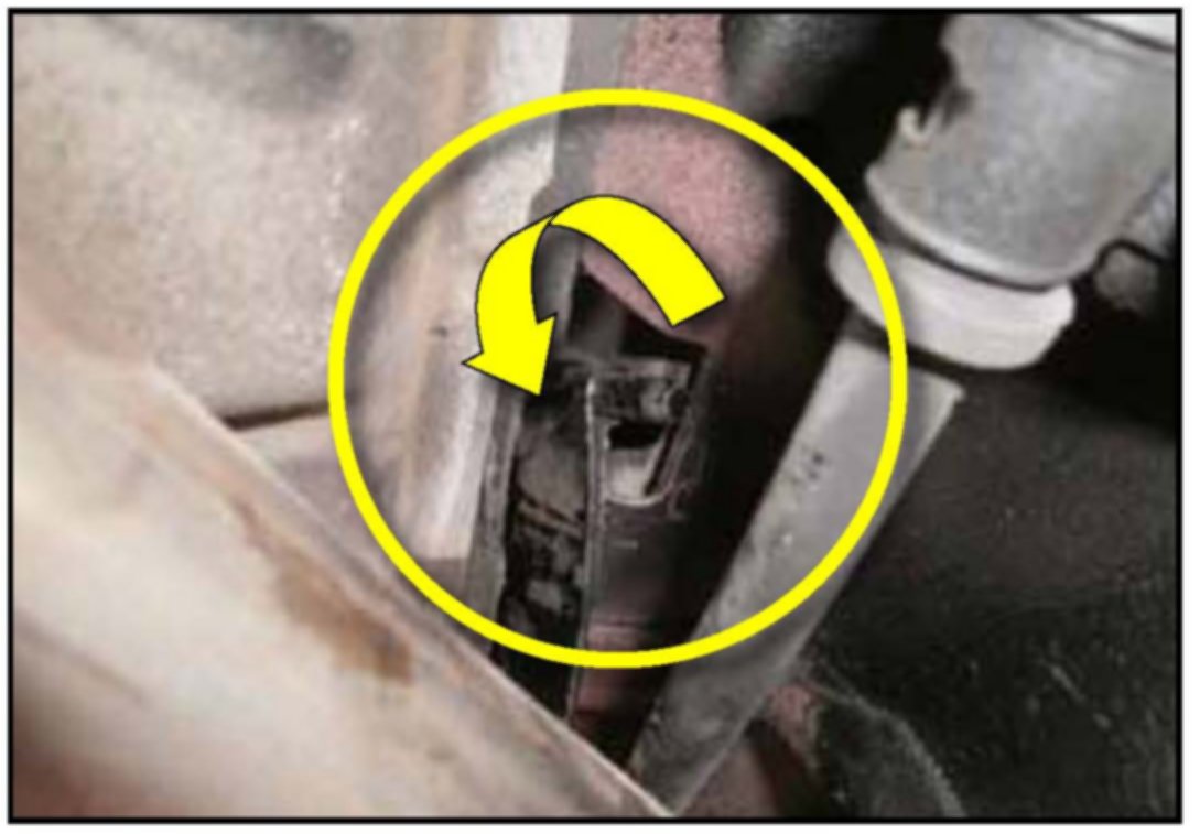 4. Angle the fuel tank strap to aid in the removal process as indicated in the photo.