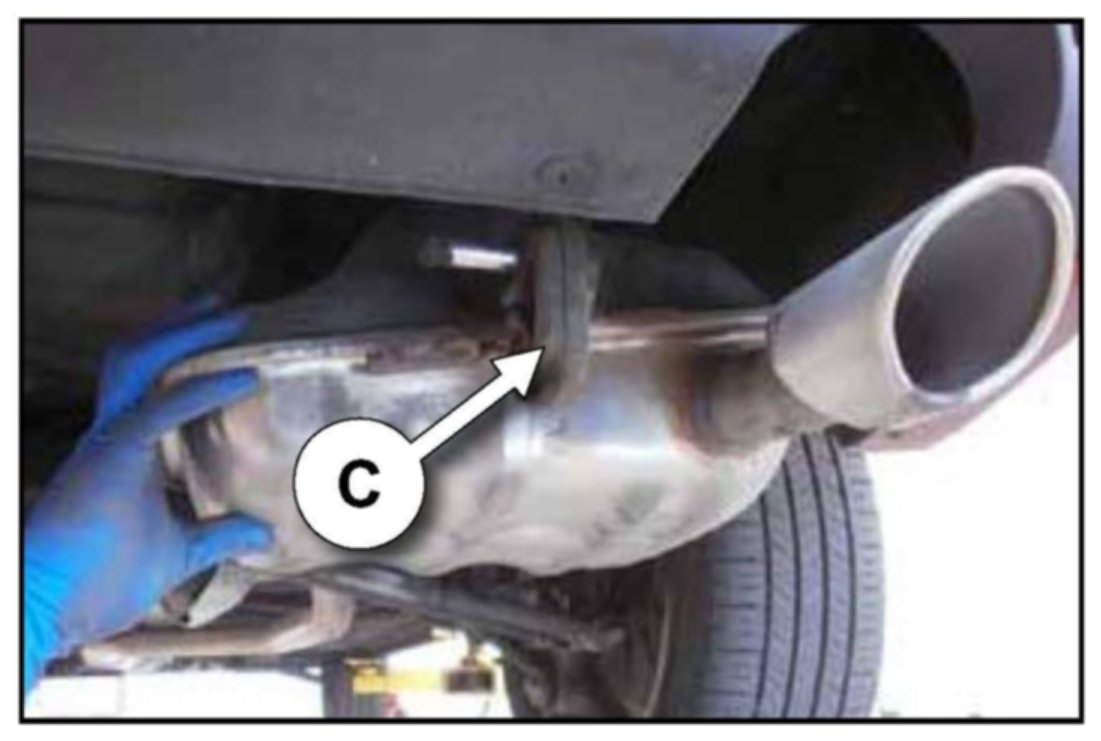 6. Remove all five (5) exhaust hangers starting with the front first (A) then the rear (C) and center (B) hangers.