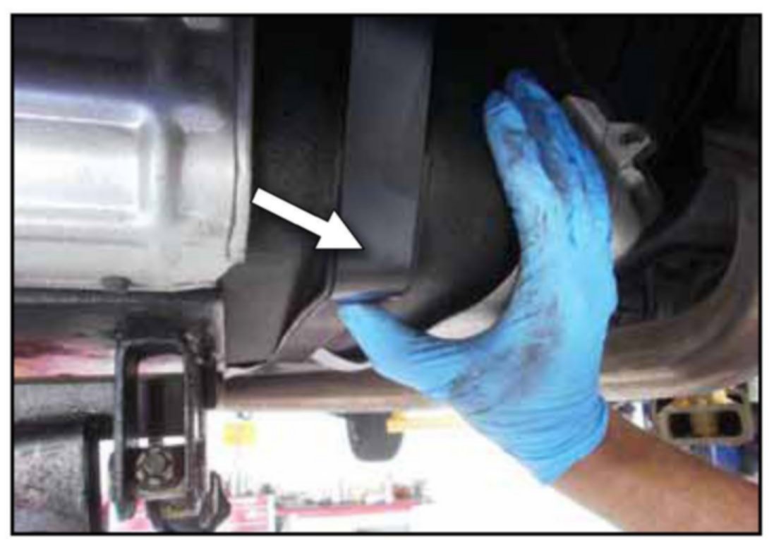 7. After the exhaust hangers have been removed, carefully push the exhaust pipe aside to avoid interference with right-hand side fuel tank strap.