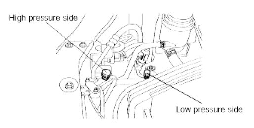 1. Connect a R-134a refrigerant Recovery/Recycling/Charging System to the high-pressure service port and the low-pressure service port as shown, following the equipment manufacturer's instructions.