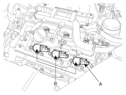 When removing the ignition coil connector, pull the lock pin(A) and push the clip(B).