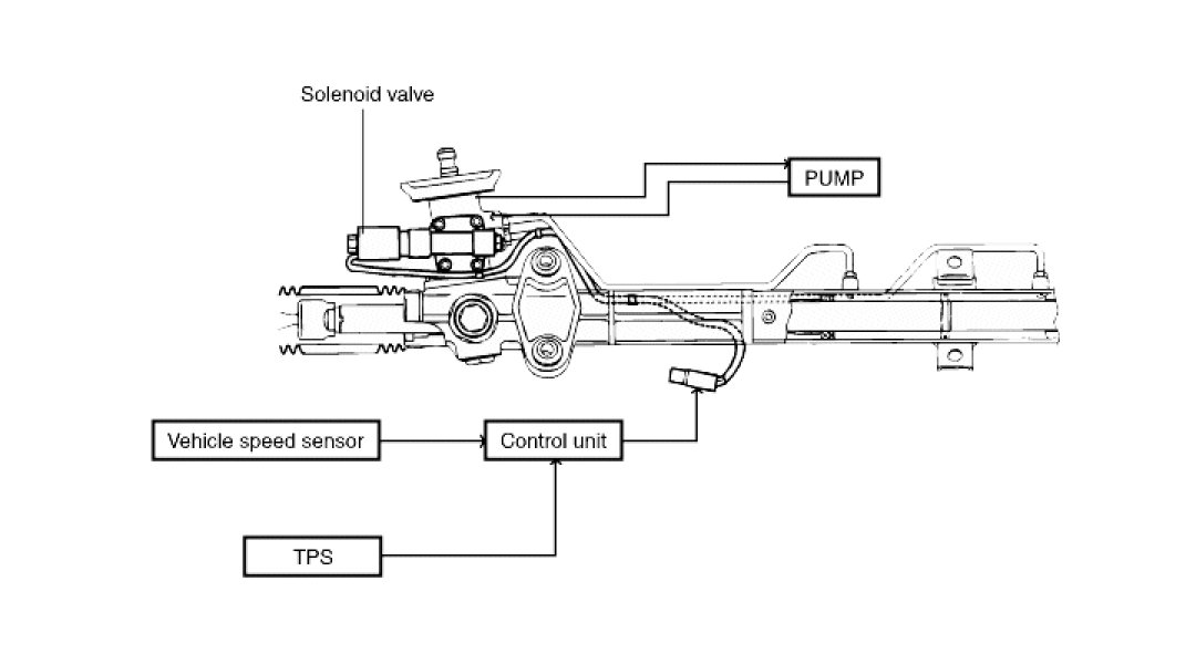 In addition, it has a solenoid valve on power steering gear box. To control the oil flow of steering gear box, a solenoid is provided and it functions by the current from control module which receives signals from VSS (Vehicle Speed Sensor) and TPS.