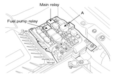 To prevent fuel being injected from injectors while the engine is being cranked, remove the fuel pump(A) relay from the fuse box.
