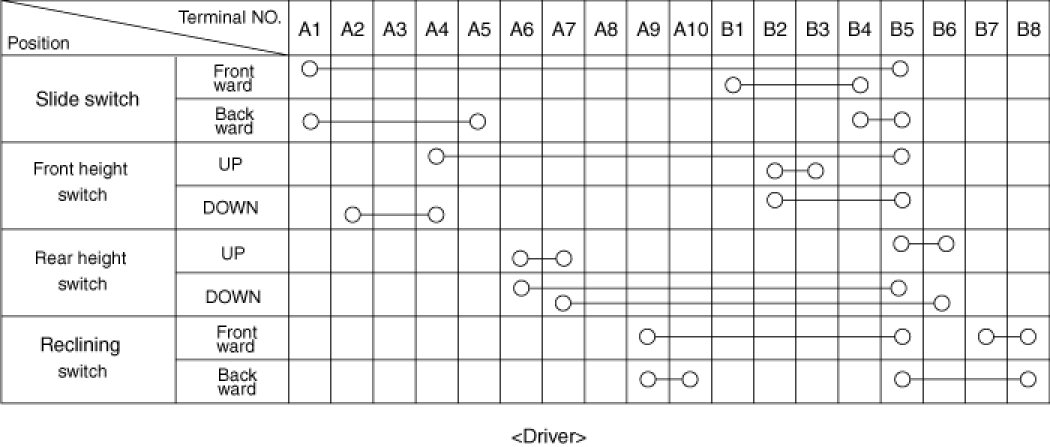 in each position, make sure that continuity exists between the terminals below. If continuity is not as specified, replace the power seat switch.