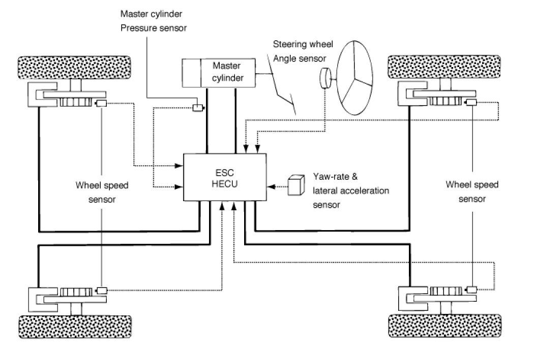 ESC essentially consists of three assemblies : the sensors, the electronic control unit and the actuators.