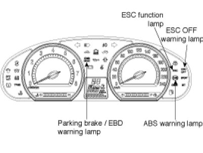 The active EBD warning lamp module indicates the self-test and failure status of the EBD. However, in case the Parking Brake Switch is turned on, the EBD warning lamp is always turned on regardless of EBD functions. The EBD warning lamp shallbe on: