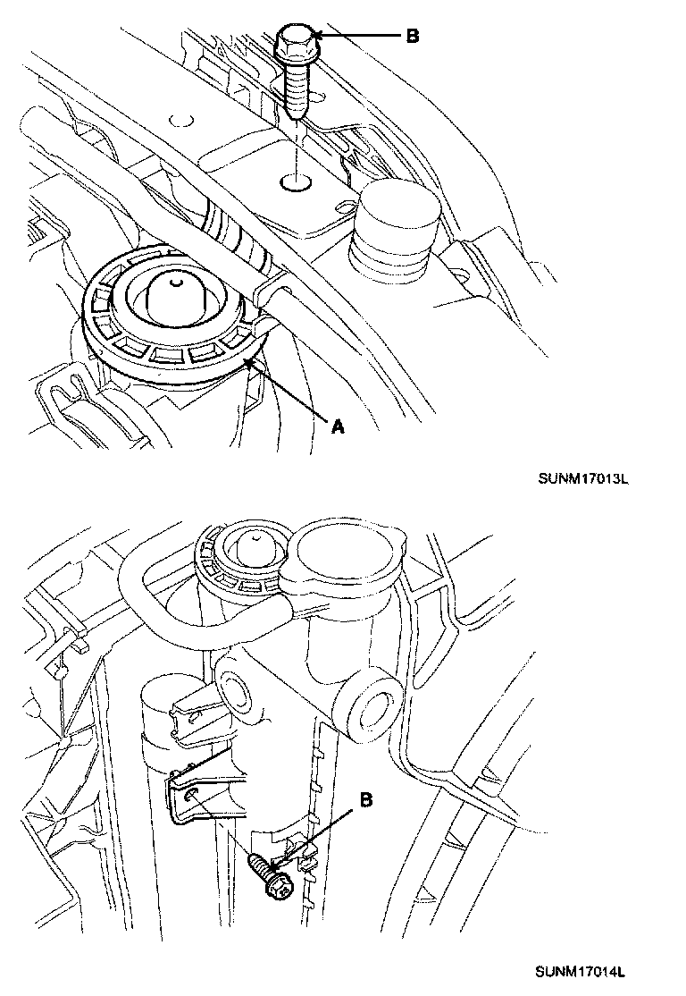 5. Disconnect the radiator upper hose(A) and the lower hose(B).