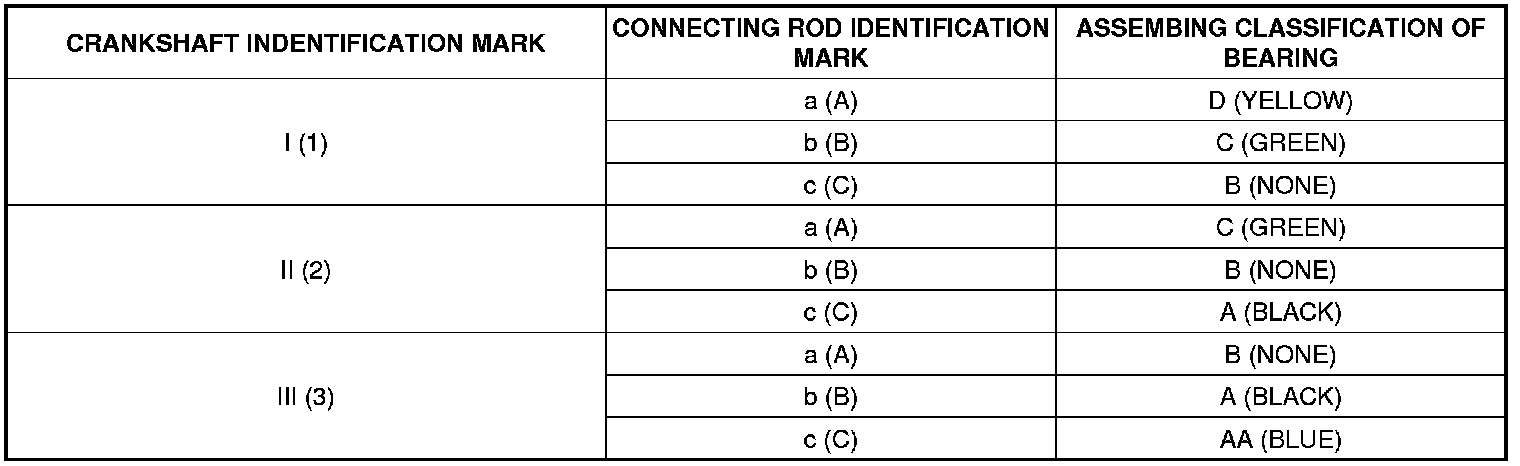 (6) If the Plastigage measures too wide or too narrow, remove the upper half of the bearing, install a new, complete bearing with the same color mark (select the color as shown in the next column), and recheck the clearance.