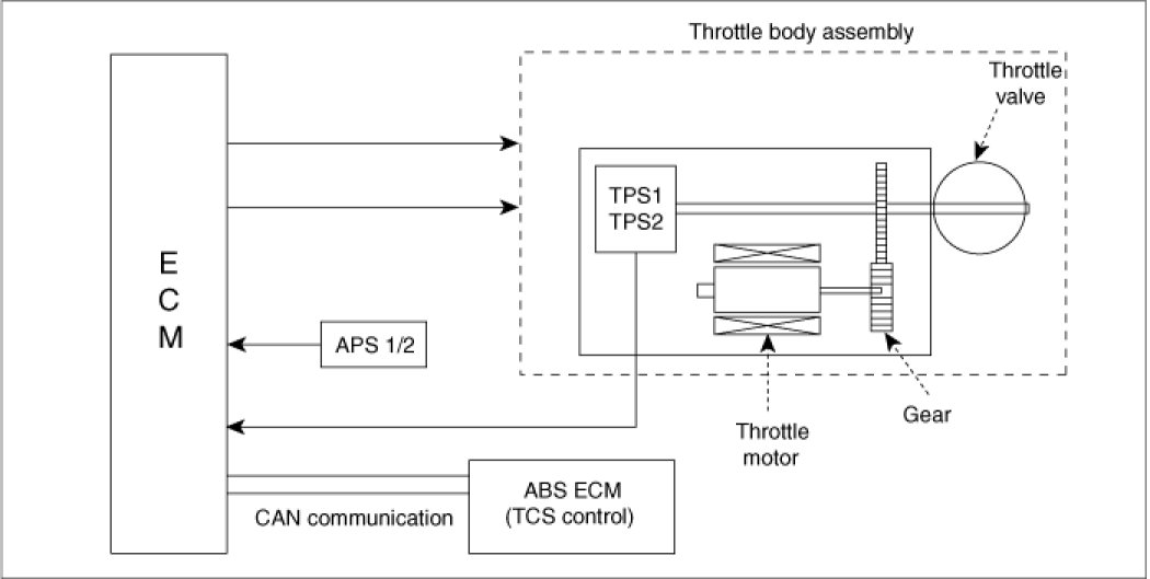 ECM receives accelerator position sensor signals (APS1, APS2) and calculates appropriate throttle opening angle which is used to control the throttle angle of throttle motor.