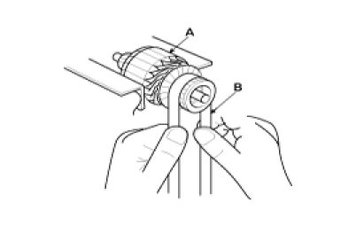 4. Check the commutator (A) surface. If the surface is dirty or burnt, resurface with emery cloth or a lathe within the following specifications, or recondition with #500 or #600 sandpaper (B).