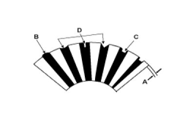 6. Check the mica depth (A). If the mica is too high (B), undercut the mica with a hacksaw blade to the proper depth. Cut away all the mica (C) between the commutator segments. The undercut should not be too shallow, too narrow, or v-shaped (D).