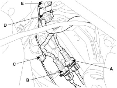 (1) Disconnect the No.1/No.2 knock sensor connectors(A,B), the oil pressure switch connector(C), the ignition coil harness(D) and the No.1 VIS(Variable Induction System) connector(E).