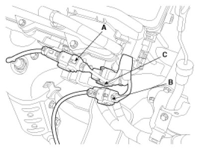 (5) Disconnect the MAPS(Manifold Absolute Pressure Sensor) connector(A), the ETC(Electronic Throttle Control) connector(B) and the PCSV(Purge Control Solenoid Valve) connector(C).
