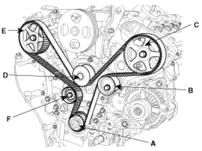 Crankshaft sprocket(A) -> Idler(B) -> Bank 2 exhaust camsprocket(C) -> Water pump pulley(D) -> Bank 1 exhaust camsprocket(E) -> Tensioner pulley(F).