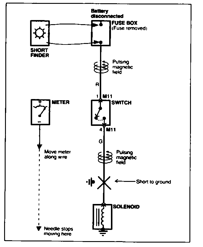 E. Beginning at the fuse box, slowly move the short finder along the circuit wiring. The meter will show current pulses through sheet metal and body trim. As long as the meter is between the fuse and the short, the needle will move with each current pulse. Once the meter is moved past the point of the snort, the needle will stop moving. Check around this area to locate the cause of the short circuit.