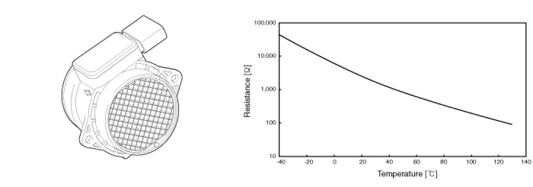 Intake Air Temperature Sensor (IATS) is installed inside the Mass Air Flow Sensor (MAFS) and detects the intake air temperature. To calculate precise air quantity, correction of the air temperature is needed because air density varies according to the temperature. So the ECM uses not only MAFS signal but also IATS signal. This sensor has a Negative Temperature Coefficient (NTC) and its resistance is in inverse proportion to the temperature.