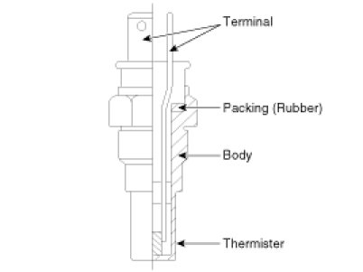 4. After immersing the thermistor of the sensor into water (or engine coolant), measure resistance between OTS terminals 1 and 2.