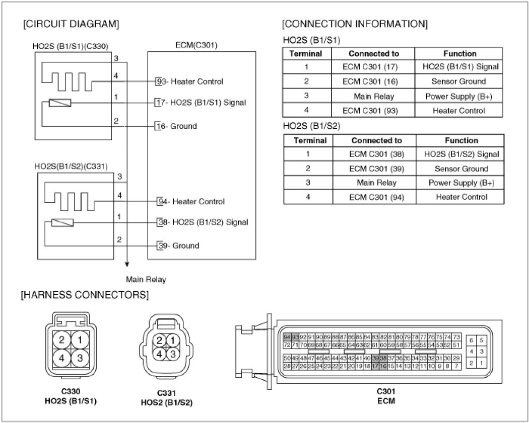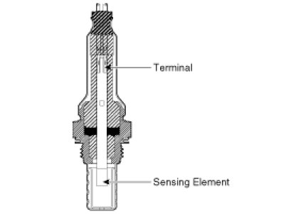 Heated Oxygen Sensor (HO2S) consists of zirconium and alumina and is installed on upstream and downstream of the Manifold Catalyst Converter (MCC). After it compares oxygen consistency of the atmosphere with the exhaust gas, it transfers the oxygen consistency of the exhaust gas to the ECM. When A/F ratio is rich or lean, it generates approximately 1V or 0V respectively. In order that this sensor normally operates, the temperature of the sensor tip is higher than 370°C (698°F). So it has a heater which is controlled by the ECM duty signal. When the exhaust gas temperature is lower than the specified value, the heater warms the sensor tip.