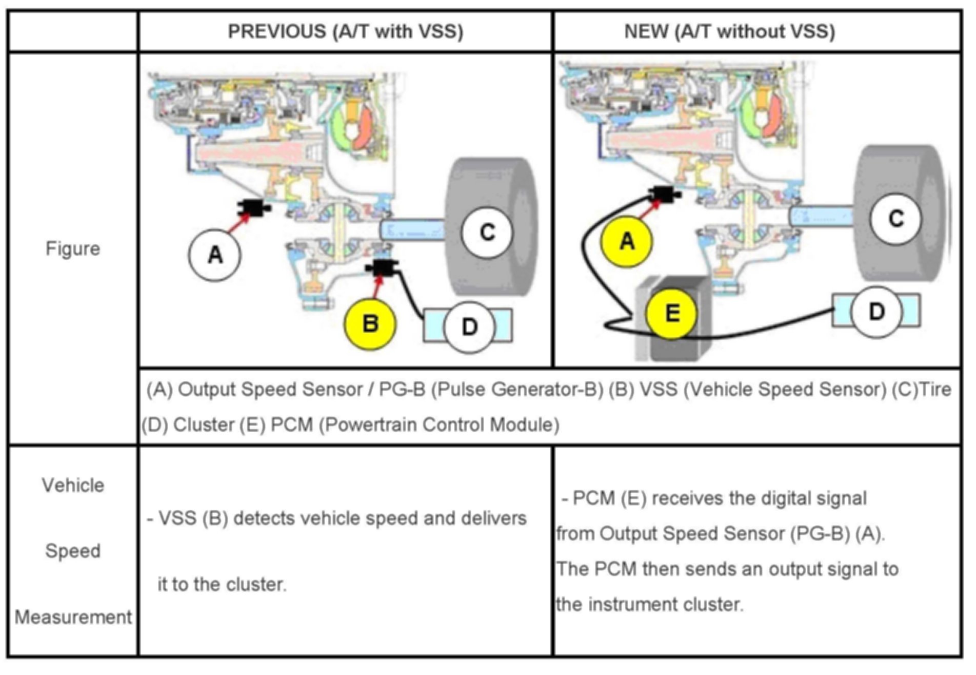 This Pitstop bulletin provides information relating to changes to the vehicle speed sensor (VSS) on Optima and Rondo vehicles equipped with the 2.4L (I-4) engine/automatic transmission. Effective from July 2007, production, the VSS sensor has been deleted from the powertrain & wiring infrastructure. Optima and Rondo vehicles produced after July 2007, now utilize the digital signal from the Transmission Output Speed Sensor (Pulse Generator-B), which reports the vehicle speed to Powertrain Control Module (PCM). The PCM then reports the VSS signal to the instrument cluster for the miles per hour display (MPH). Service and parts documentation will be updated in the future to reflect these modifications.