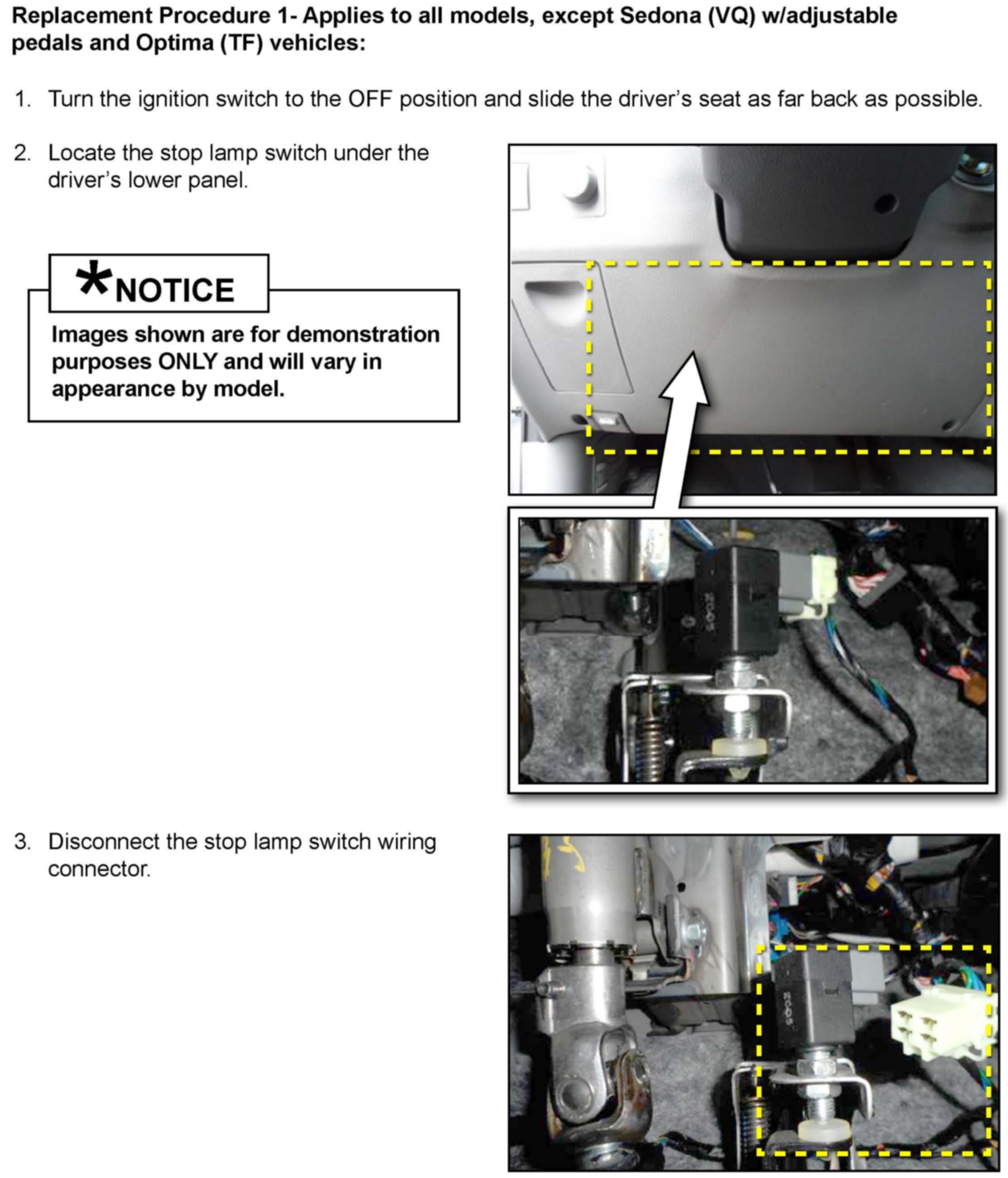 Replacement Procedure 1-Applies to all models, except Sedona (VQ) w/adjustable pedals and Optima (TF) vehicles above.