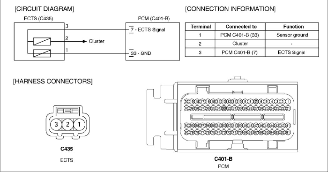 Engine Coolant Temperature Sensor (ECTS) is located in the engine coolant passage of the cylinder head for detecting the engine coolant temperature. The ECTS uses a thermistor whose resistance changes with the temperature. The electrical resistance of the ECTS decreases as the temperature increases, and increases as the temperature decreases. The reference 5 V in the PCM is supplied to the ECTS via a resistor in the PCM.That is, the resistor in the PCM and the thermistor in the ECTS are connected in series. When the resistance value of the thermistor in the ECTS changes according to the engine coolant temperature, the output voltage also changes. During cold engine operation the PCM increases the fuel injection duration and controls the ignition timing using the information of engine coolant temperature to avoid engine stalling and improve drivability.