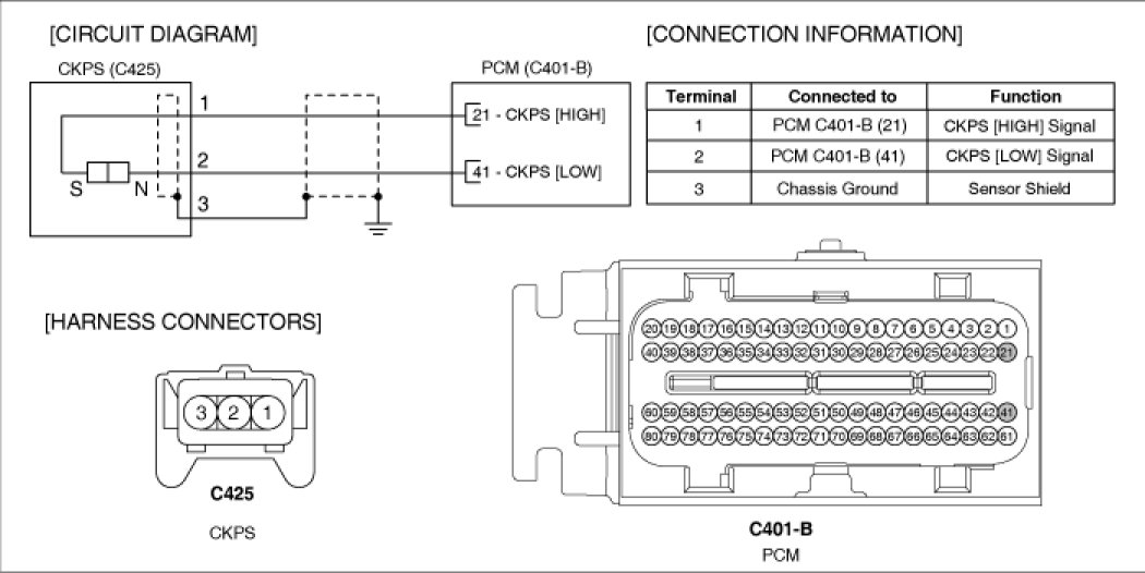 Crankshaft Position Sensor (CKPS) detects the crankshaft position and is one of the most important sensors of the engine control system. If there is no CKPS signal input, fuel is not supplied. That is, vehicle can't run without CKPS signal. This sensor is installed on transaxle housing and generates alternating current by magnetic flux field which is made by the sensor and the target wheel when engine runs. The target wheel consists of 58 slots and 2 missing slots on 360 degrees CA (Crank Angle).