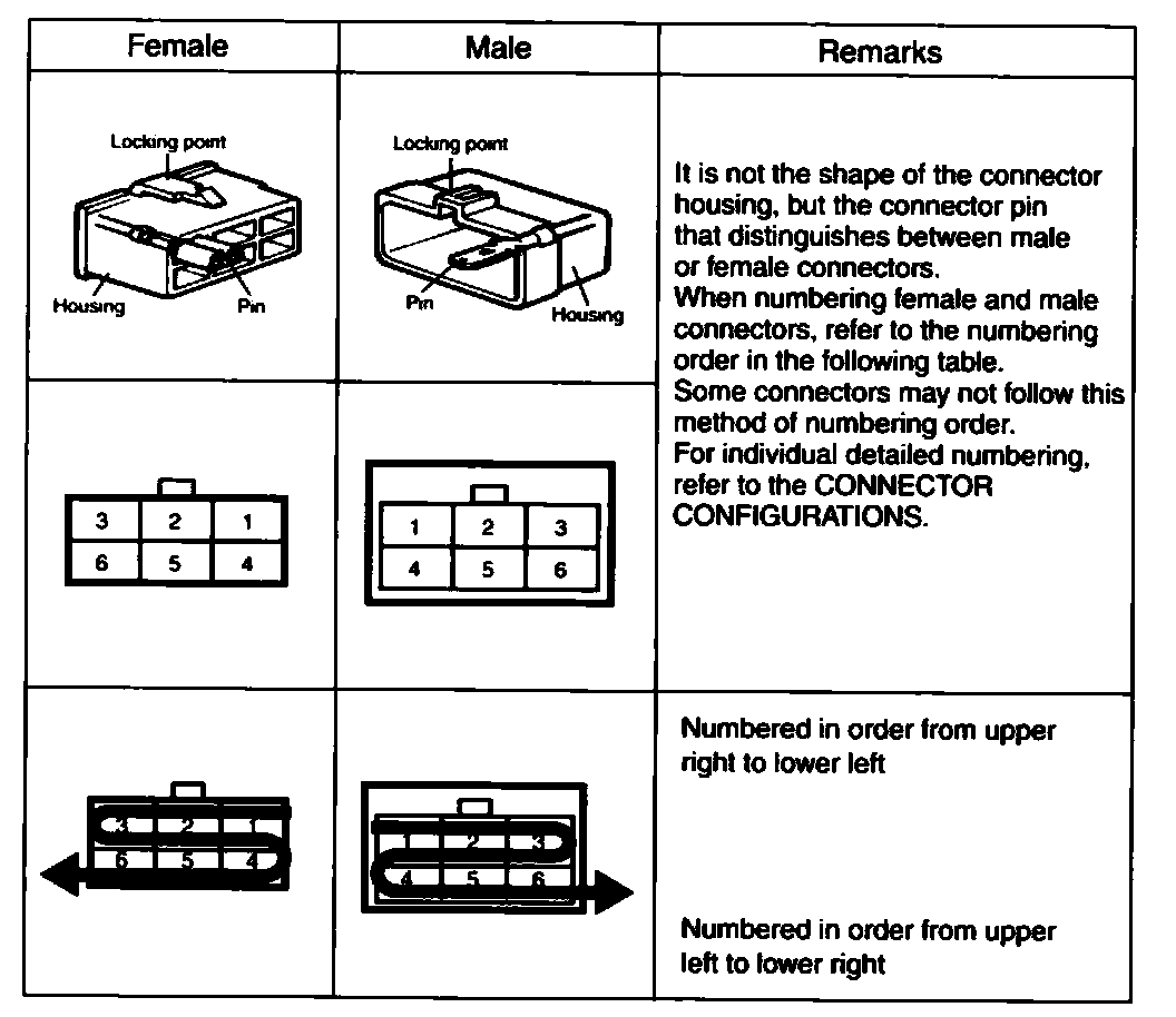 - The "Connector Configurations" section identifies connectors that are used to join harnesses together; junction connectors for common power and ground wires are also identified in this section. Male and female connector views are shown where applicable.