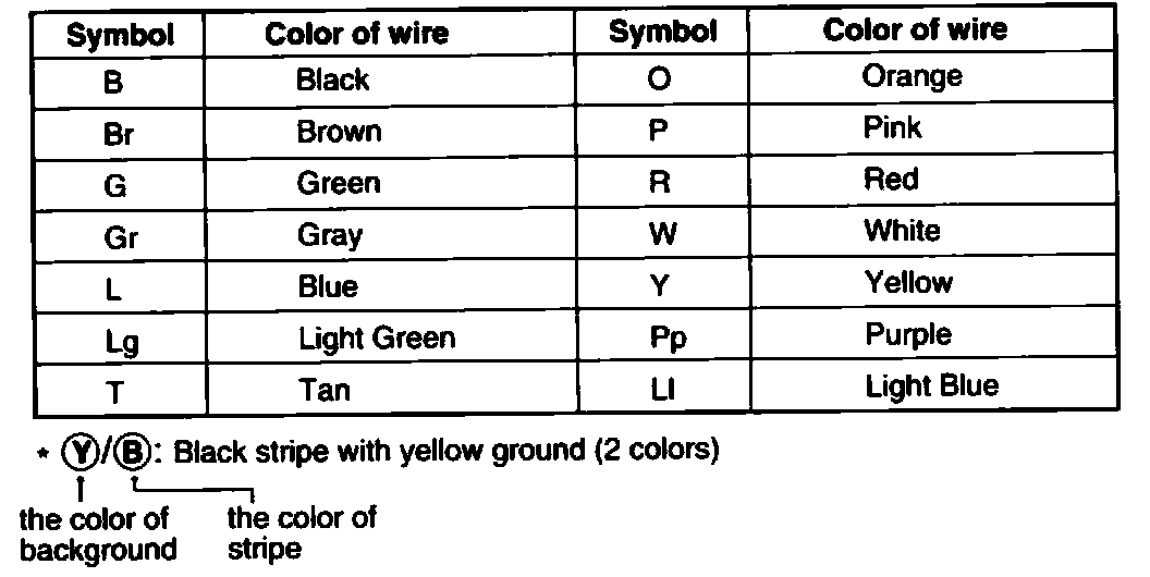 The following abbreviations are used to identify wire colors in the circuit schematics.