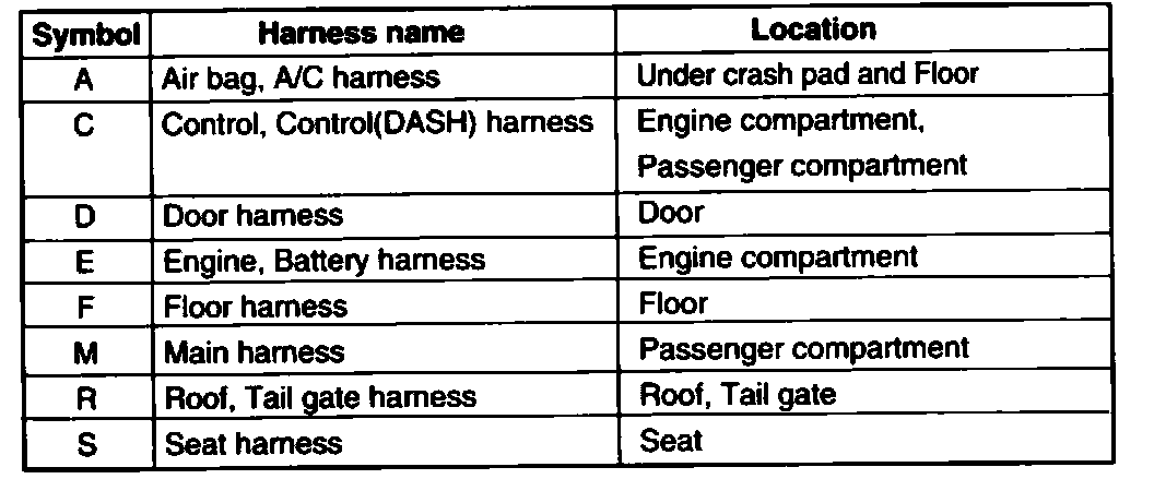 - It depends on vehicles, it is necessary to check the harness name symbol on the harness layouts for detailed symbol.