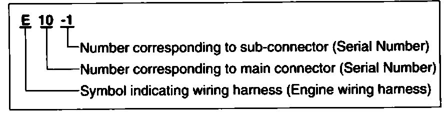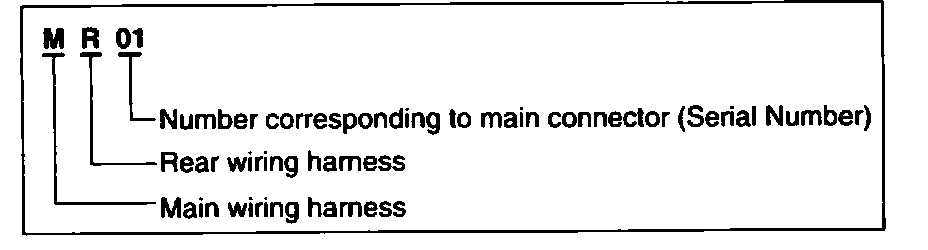 A connector identification symbol consists of a wiring harness location classification symbol corresponding to a wiring harness location and number corresponding to the connector.