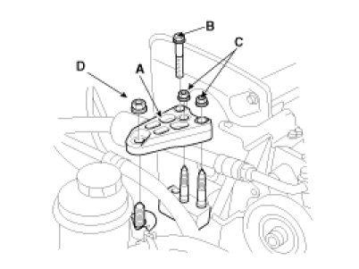 (2) Remove the bolt(B), three nuts(C, D) and engine mount bracket (A).