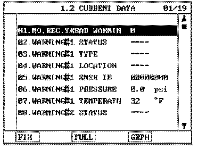WARNING STATE SCREEN:The WARNING STATE screen displays data related to pressure/temperature warning conditions detected by the TPMS sensors.