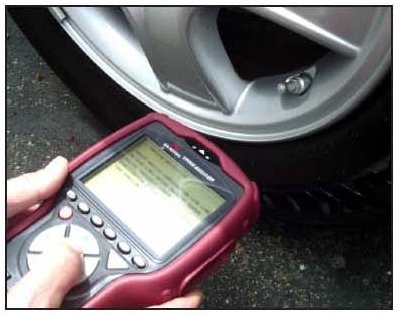 Disconnect the DLC cable. Place the TPMS Exciter within 3 inches of the valve stem; point the arrow at the top of the TPMS exciter directly at the valve stem.