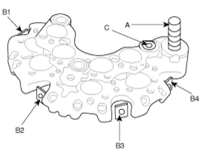 1. Check for continuity in each direction, between the B terminal(A) and P terminals(B), between the E terminal(C) and P terminals(B) of each diode pair. All diodes should have continuity in only one direction. Because the rectifier diodes are designed to allow current to pass in one direction, and the rectifier is made up of eight diodes(four pairs), you must test each diode in both directions for continuity with an ohmmeter that has diode checking capability: a total of 16 checks. If any diode failed, replace the rectifier assembly.