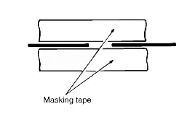 Wipe the glass adjacent to the broken heater line, clean with silicone remover and attach the masking tape as shown. Shake the conductive paint container well, and apply three coats with a brush at intervals of about 15 minutes apart. Remove the tape and allow sufficient time for drying before applying power. For a better finish, scrape away excess deposits with a knife after the paint has completely dried. (allow 24 hours).