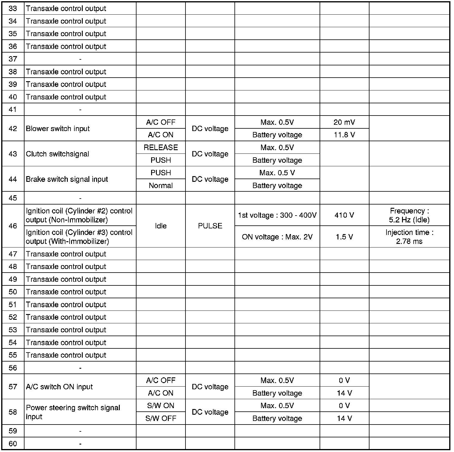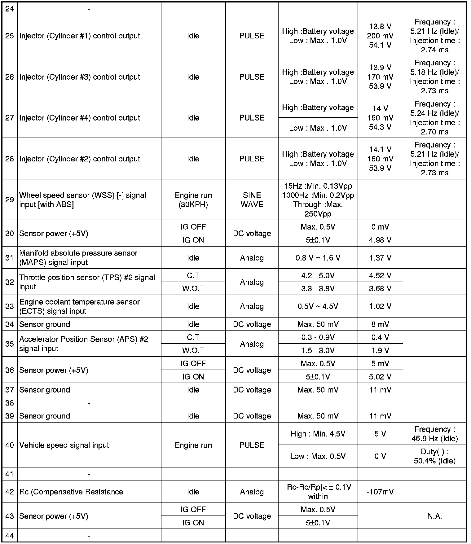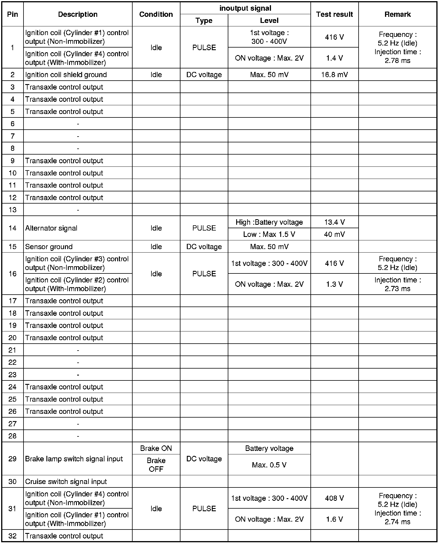 Pinout Values and Diagnostic Parameters