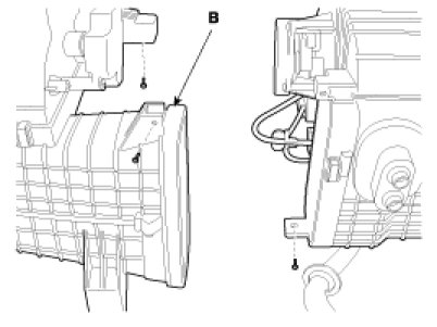 5. Remove the blower unit (B) from the heater unit after loosening a mounting bolt and 3 screws.
