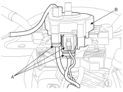 11. Disconnect the connectors (A) from the clock spring and then remove the clock sprig (B) from the steering column.