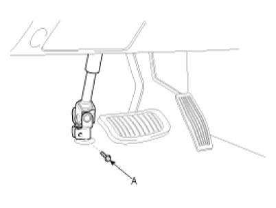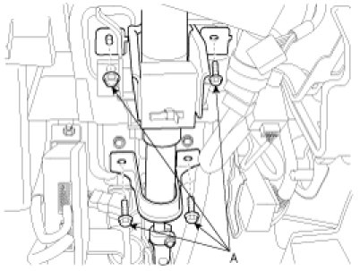14. Remove the steering column assembly by loosening the steering column mounting bolts and nut (A).