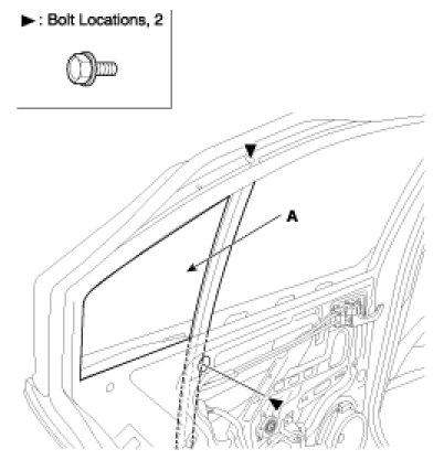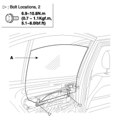 4. Carefully move the glass (A) until you can see the bolts, then loosen them. Separate the glass from the glass run and carefully pull the glass out through the window slot.