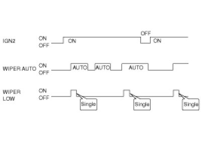 3. A single wipe will be performed whenever rain has been detected (Rain Detected signal from Rain sensor) and the wiper switch is moved to the AUTO position. But a single wipe will not be performed when the wiper switch is moved to the AUTO position and OFF signal is being received from Rain sensor. But if the wiper switch is moved to AUTO position for the first time since vehicle ignition switch is turned on then a single wipe will be performed regardless of Rain Detected or OFF signal.