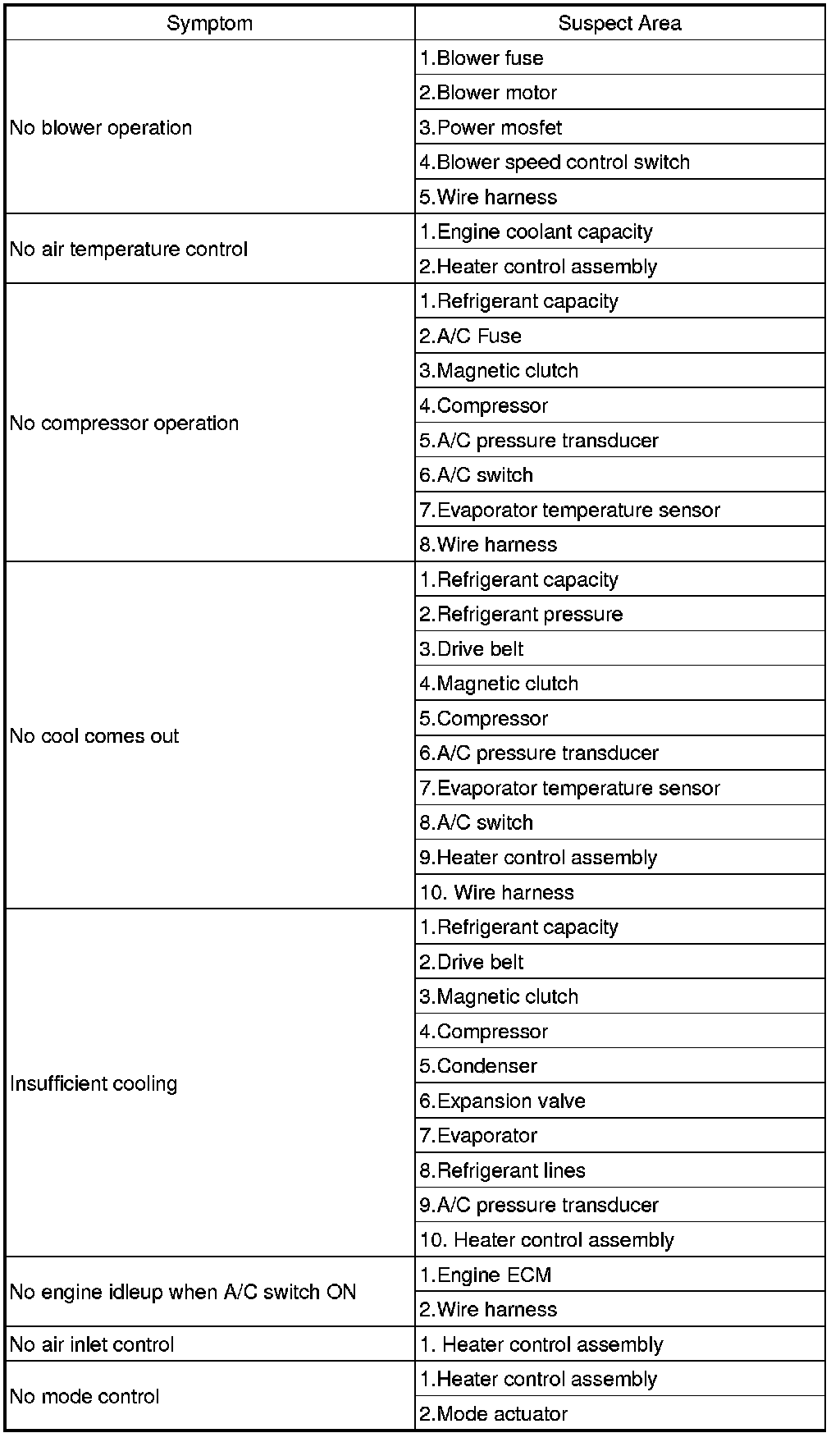 Use the table below to help you find the cause of the problem. The numbers indicate the priority of the likely cause of the problem. Check each part in order. If necessary, replace these parts.
