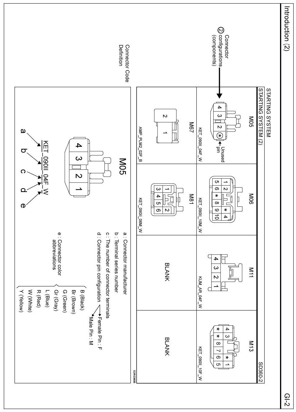 - The pages following the schematic diagrams contain data related to component connector configuration. Each page shows a terminal side view of the connector. Refer to the "Connector View and Numbering Order" section in this document for information related to terminal numbering.