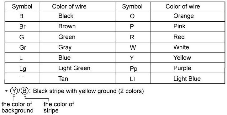The following abbreviations are used to identify wire colors in the circuit schematics.