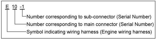 A connector identification symbol consists of a wiring harness location classification symbol corresponding to a wiring harness location and number corresponding to the connector.