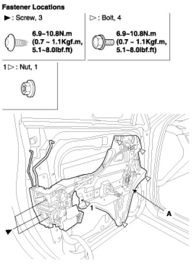 4. Loosen the door module mounting bolts, then remove the door module (A).