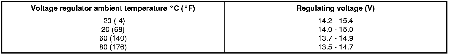 1. If the voltmeter reading agrees with the value listed in the regulating voltage table below, the voltage regulator is functioning correctly. If the reading is other than the standard value, the voltage regulator or the generator is faulty.