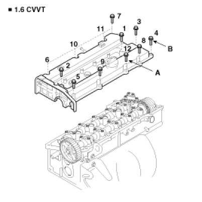 12. Install the timing belt upper cover(A) with 4 bolts(B).