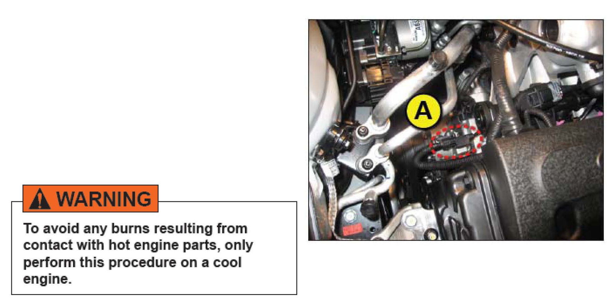 1. With the vehicle on the ground, disconnect the knock sensor wiring connector (A).