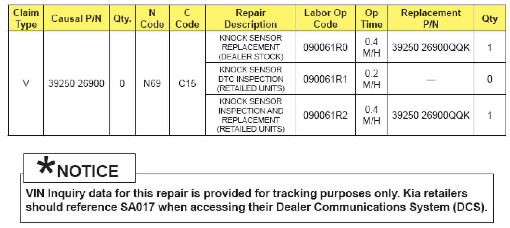 Some Rio (JB) vehicles equipped with the Alpha engine (1.6L) may illuminate a MIL related to knock sensor codes P0326 (Knock Sensor 1 Circuit Range/Performance) and/or P0327 (Knock Sensor 1 Circuit Low Input). In order to repair this concern, a knock sensor replacement is necessary. Vehicles affected are 2009MY Rio (JB) with the 1.6L Alpha engine with production dates ranging from 3/03/09 to 4/30/09. All units in dealer stock require replacement, whereas sold units will require DTC